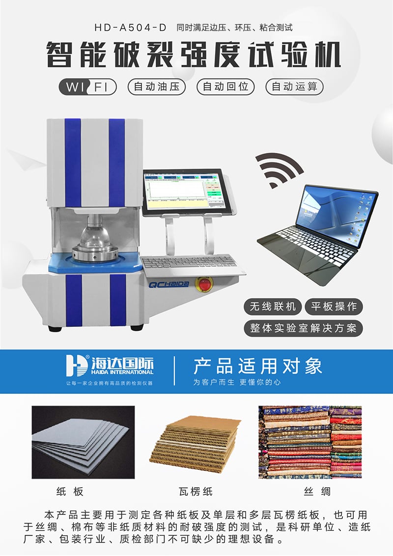 二、破裂試驗機產品介紹:紙張破裂試驗機是國際通用型繆綸(Mullen)式儀器是紙和紙板強度性能檢測的基本儀器,主要用于測定各種紙板及單層和多層瓦楞紙板,也可用于絲綢、棉布等非紙質材料的耐破強度的測試。本儀器操作簡單、性能可靠、技術先進,是科研單位、造紙廠家、包裝行業、質檢部門不可缺少的理想設備。